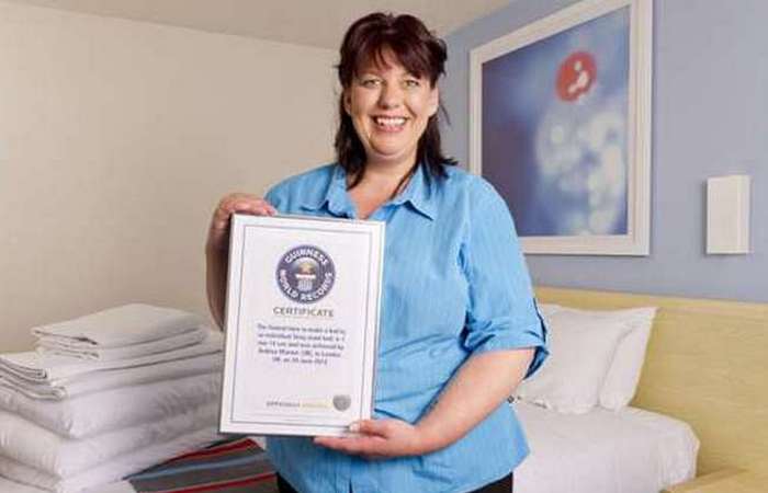 Английский менеджер отеля Андреа Уорнер установила рекорд по самому быстрому застиланию двуспальной кровати, уложившись всего в 74 секунды. За это время она надела простынь на матрас, заправила одеяло в пододеяльник, застегнула его, заправила две подушки в наволочки и застелила поверх декоративную дорожку.