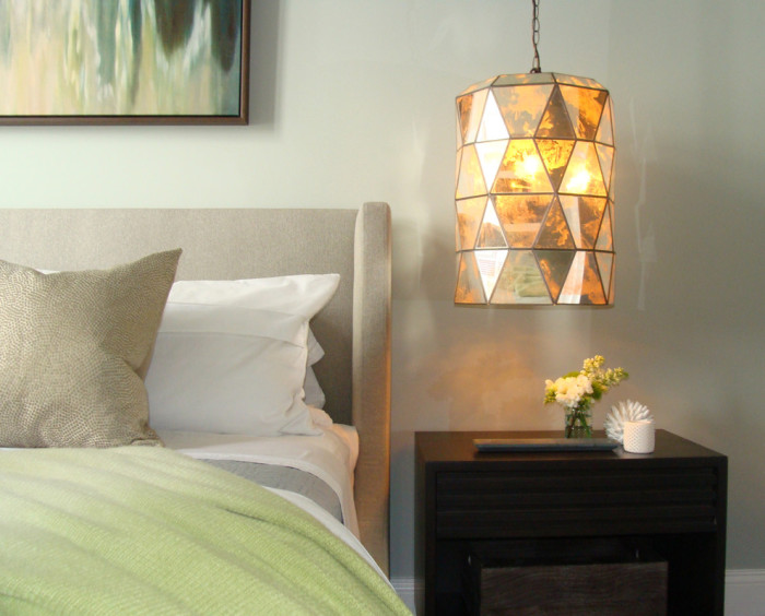 Обычные лампы, стоящие около кровати, выглядят скучно. А подвесные светильники еще и позволят сэкономить драгоценное пространство в небольшой спальне.