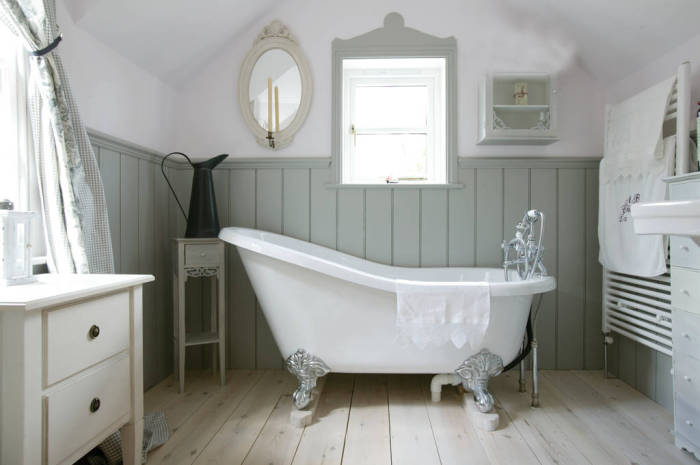 Панели в нижней части стены защищают ее от попадания влаги не менее надежно, чем привычный кафель. Оставшееся пространство покрывают влагостойкой краской.