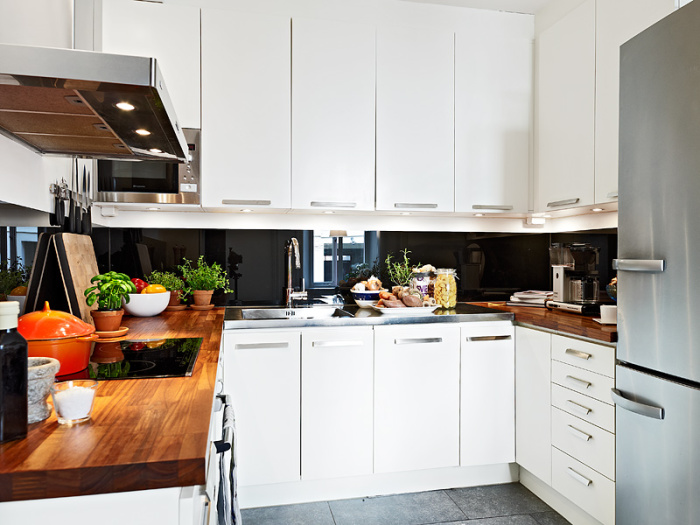 Теплая фактура натурального дерева удачно смягчает холодность интерьера кухни, где преобладает белый цвет.