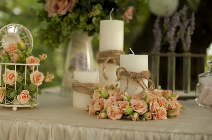 Мелкие искусственные цветы используются для декора подсвечников. Обклейте ими выбранную основу, используя клей «жидкие гвозди».