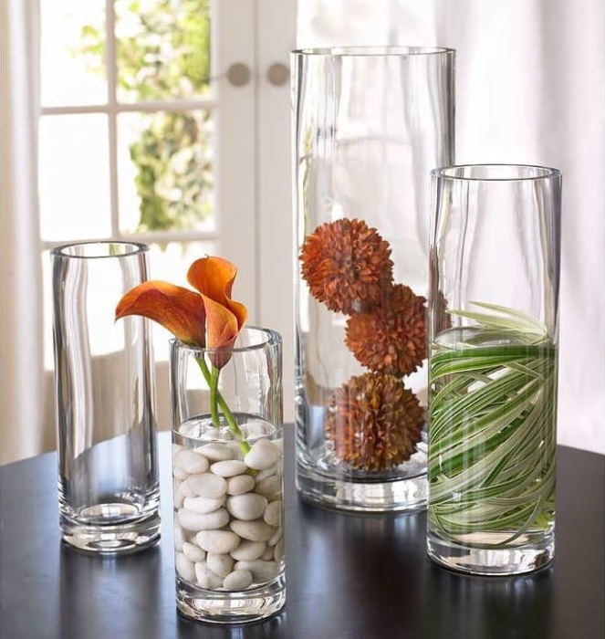 Обычные вазы-стаканы легко преобразить. Наполните их водой и погрузите в нее зеленую траву или камешки. Затем поставьте в обновленные вазы цветы.