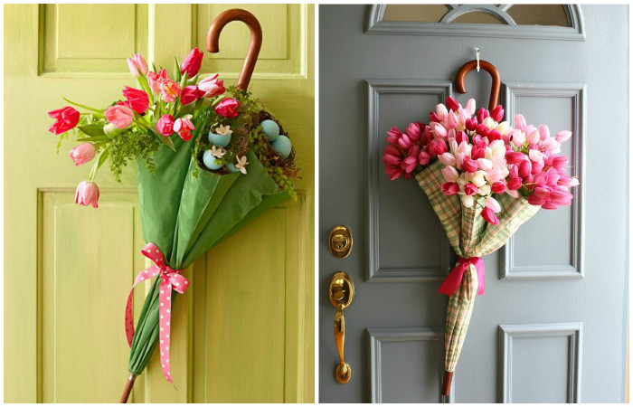 Сложенный зонтик станет надежным настенным креплением для тонкой вазы, спрятанной внутри него. Вместо вазы можно использовать тонкие пробирки, наполненные водой.