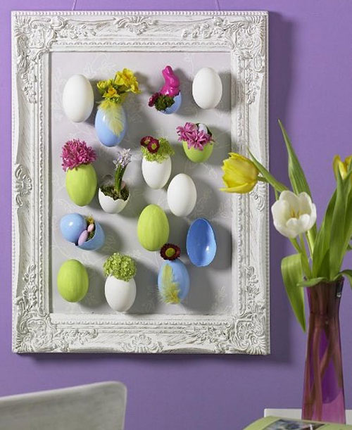 Для изготовления такого панно понадобится десяток пустых яичных скорлупок и рама. Скорлупки, окрашенные в яркие цвета, приклеиваются туда, где обычно располагается картина. Чтобы краска легла ровно, не забудьте тщательно помыть и обезжирить их поверхность, например, протерев спиртом.