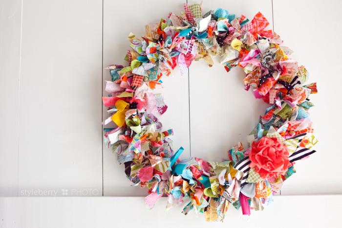 Тонкие лоскутки завяжите в узел посередине. Затем узелок приклеивается к круглой основе, например, вырезанной из плотного картона. Повторяйте процедуру до тех пор, пока не будет готов пестрый ковер на поверхности венка.