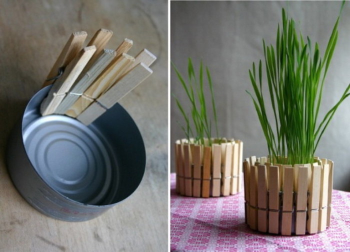 Из консервной банки и прищепок можно сделать подобие цветочного горшка. Просто закрепите их на краю емкости, и уютный весенний декор готов. Особенно эффектно в таком горшке выглядит яркая зелень.