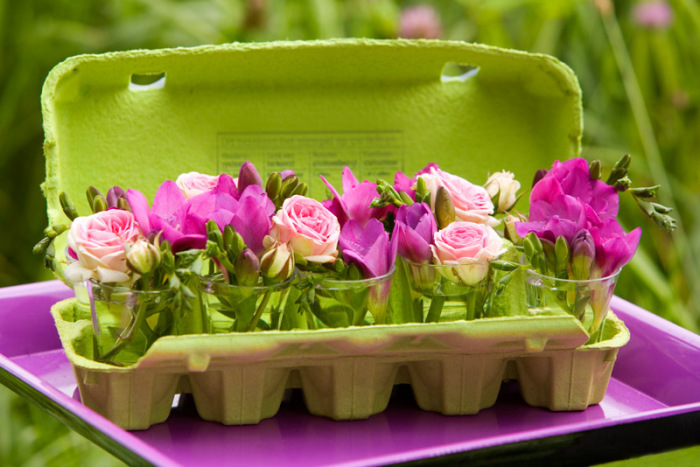 Налейте в стеклянные рюмки воду, погрузите туда по цветку. Затем поставьте такие миниатюрные вазочки в клетку из-под яиц, окрашенную в яркий цвет.