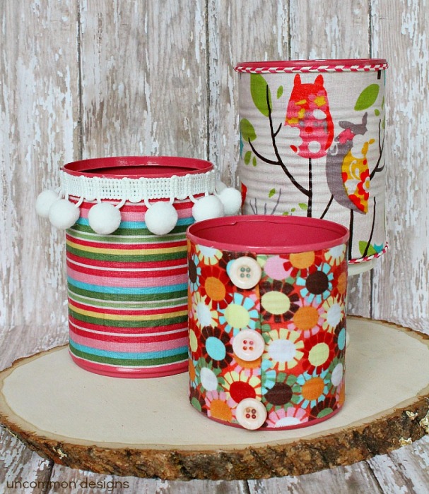 Обычные консервные банки легко превратить в цветочные горшки. Их можно разрисовать, декорировать при помощи техники «декупаж», обклеить цветным скотчем.