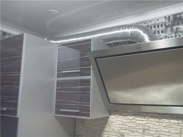 Без вытяжки на наших кухнях никуда, но вот гофра, змеей извивающаяся над кухонными шкафами, выглядит неэстетично. Именно поэтому лучше заранее предусмотреть короб для гофры или распланировать мебель на кухне так, чтобы гофра была внутри навесных шкафов.