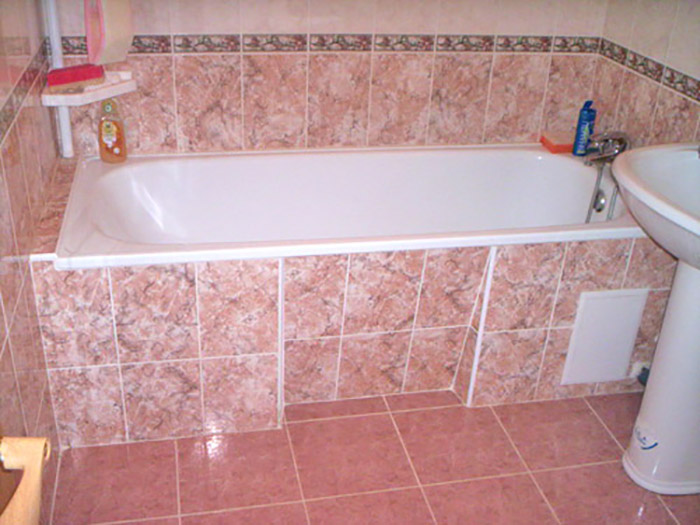 Кафель в ванной – это практично. Однако следует не забыть оставить открытой нишу под ванной. Чтобы выглядело эстетично, можно подобрать пластиковую дверцу по размеру кафельной плитки. Под ванной можно будет хранить разные бытовые мелочи.