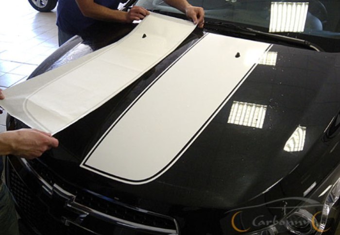 Можно не заклеивать пленкой всю машину, а сделать уникальный дизайн с помощью спортивных полос. Также популярны черные капоты и крыши.