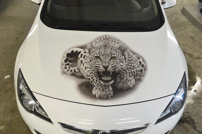 Рисунок леопарда на виниловой пленке, наклеенной на капоте. | Фото: pikabu.ru.