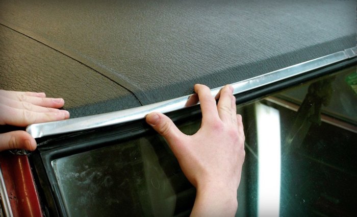 Установка декоративного элемента после поклейки «кожаной» пленки. | Фото: plenka-na-avto.ru.