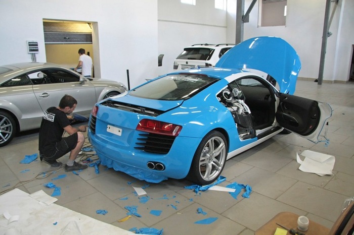 Поклейка спортивной Audi R8 голубой глянцевой пленкой. | Фото: drive2.ru.