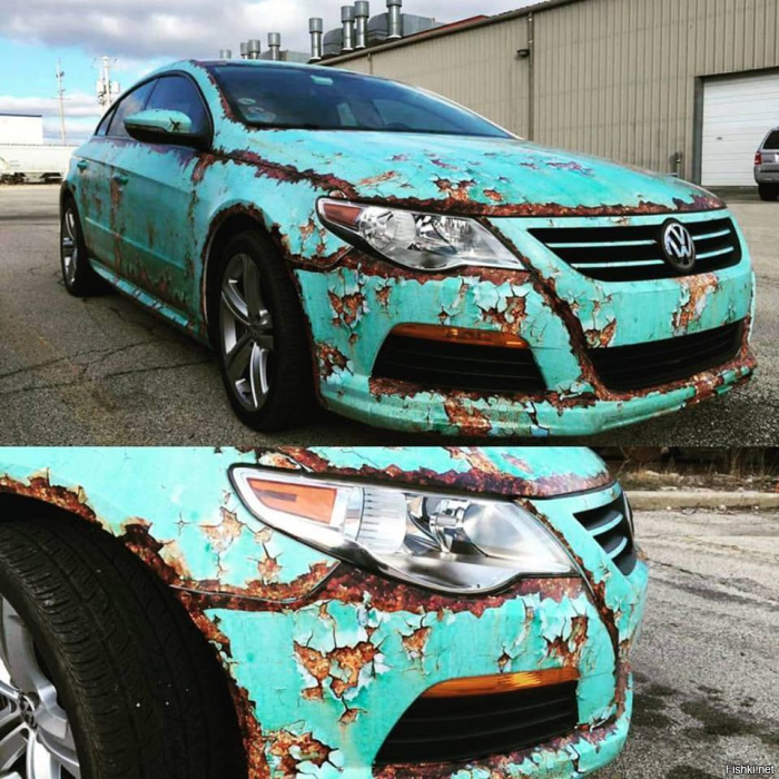 Популярный среднеразмерный седан Volkswagen Passat, оклеенный пленкой в стиле рэт-лук. | Фото: twitter.com.