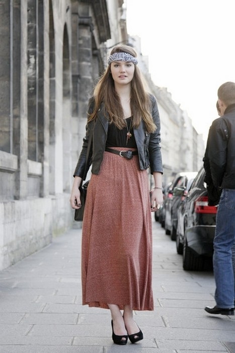 Не хотите прощаться с любимым летним платьем в пол? Как говорится, с любимыми не расставайтесь. Просто дополните его кожаной курткой-косухой, шляпой, шапкой бини или тёплой повязкой на голову.