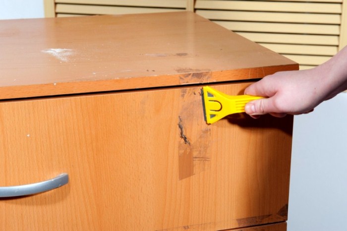 Часто бывает так, что для удобства во время переезда ящики и дверки на мебели заклеивают скотчем. Метод, конечно, варварский, но к нему часть прибегают при перевозке офисной мебели. Чтобы реанимировать шкафы, нужно использовать средства для чистки в зависимости от типа мебели.