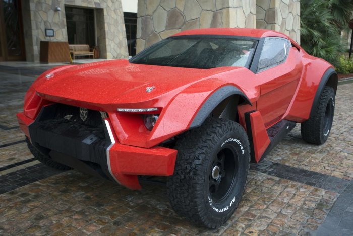Отдельного упоминания заслуживает кузов машины, не только его стилистические качества, но и технические. Что касается эстетической составляющей, то здесь у нас современная, правильная геометрия. Создается впечатление, что в дизайне нет, ни одного ненужного элемента. Все это придает машине приятный спортивный вид. При всем при этом кузов у машины очень легкий, созданный с использованием самых современных материалов, в том числе алюминия. Держится все это великолепие на прочной трубчатой стальной раме. Весит авто всего 1050 кг. Длина автомобиля – 4.2 метра, а ширина (по колесной базе) – 2.82 метра. Дорожный просвет составляет 350-450 мм, в зависимости от выбранного режима подвески. Что касается колес, то Sand Racer использует 33 × 12,5 R15.