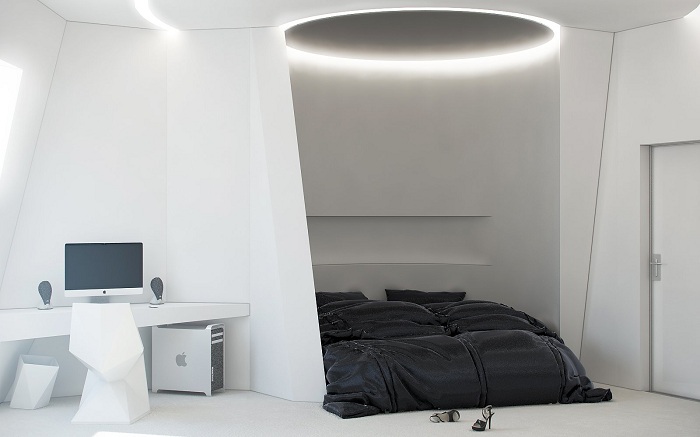 Футуристический интерьер спальной выглядит очень привлекательно и очаровательно.