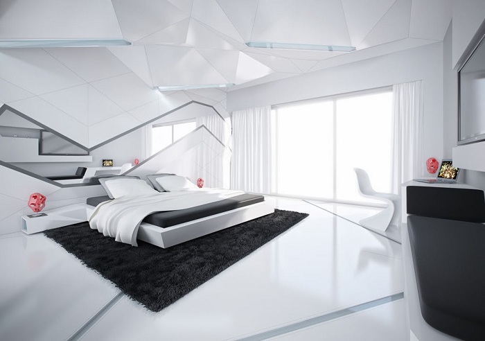 Оригинальная черно-белая спальня в футуристическом стиле.