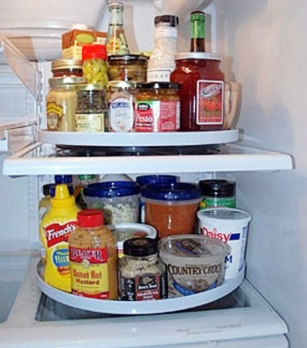 Крутящуюся подставку можно использовать для хранения кетчупов, соусов, сыров, колбас, банок с консервацией и прочих не слишком габаритных продуктов.