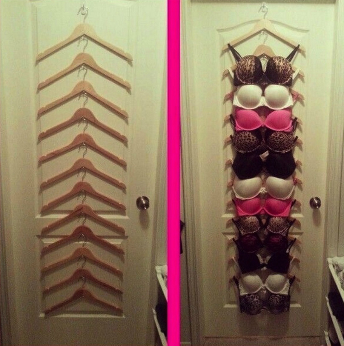 Из обычных вешалок можно смастерить отличную систему для хранения бюстгальтеров, закрепить которую можно на межкомнатной двери или на внутренней стенке гардеробной.