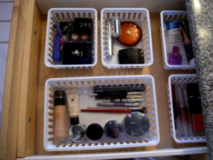 Оборудуйте выдвижной ящик в ванной небольшими пластиковыми контейнерами, чтобы организовать и систематизировать косметику.