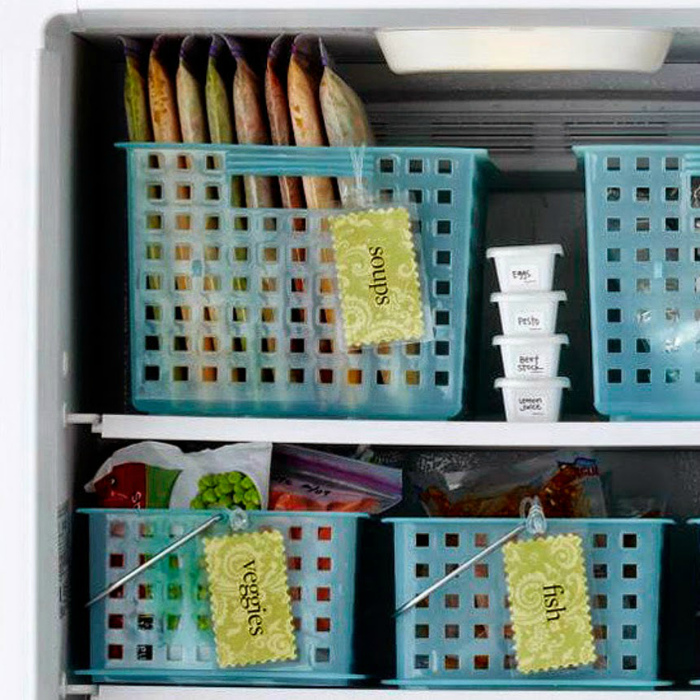 Навести порядок и грамотно организовать хранение продуктов в морозилке помогут дешевые пластиковые корзины. Просто делите продукты на группы и раскладывайте их в небольшие маркированные контейнеры.