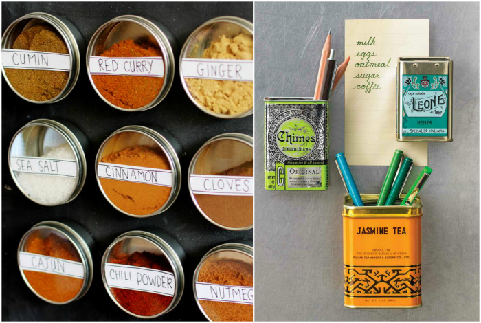 Небольшие магнитные доски можно использовать для хранения специй, емкостей с канцтоварами, а также мелких принадлежностей для творчества. Подобная идея хранения не только очень практична, но и выглядит весьма симпатично.