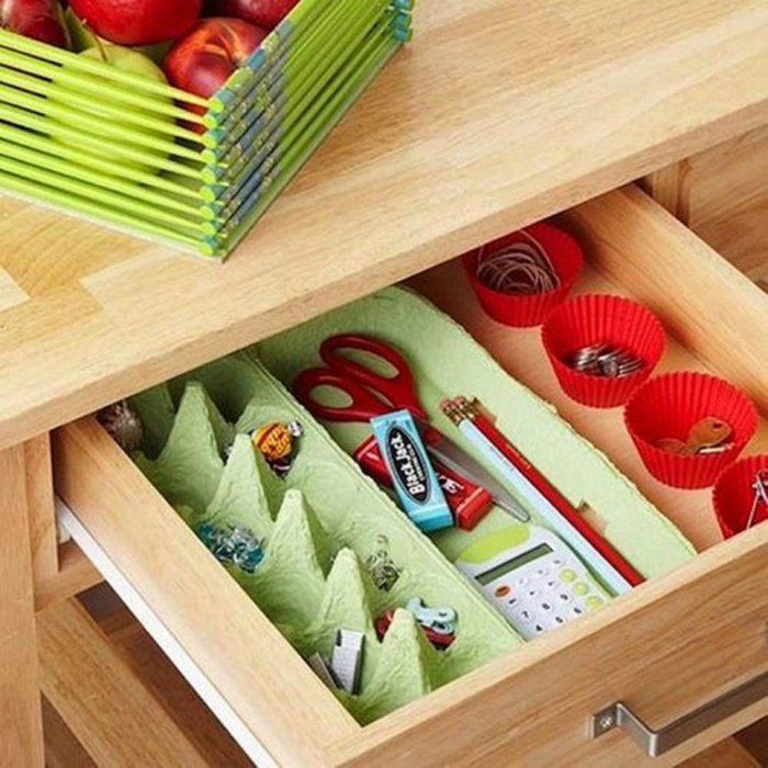 Контейнеры от яиц и формочки для кексов можно использовать для хранения мелких канцелярских принадлежностей.