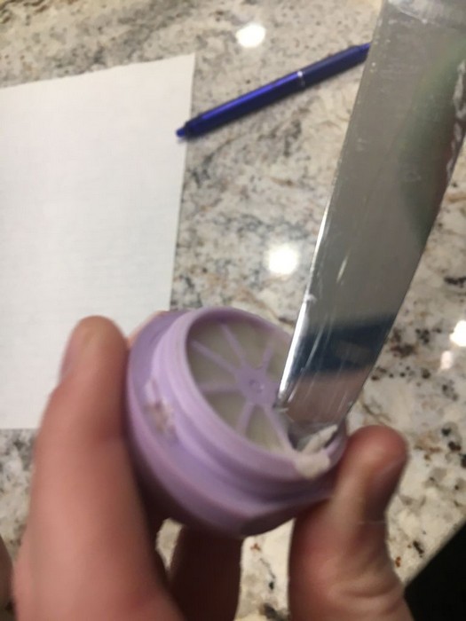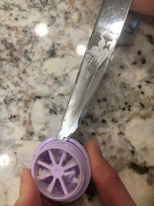 Ножом аккуратно срежьте «головку» бальзама и расчистите секторы в колесике, которое скрывается под ней.