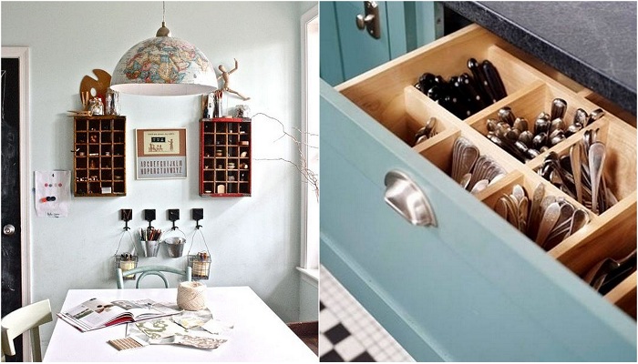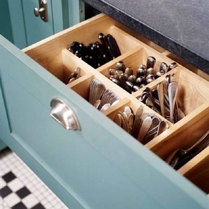 Удобное размещение столовых приборов оптимизирует пространство на кухне.